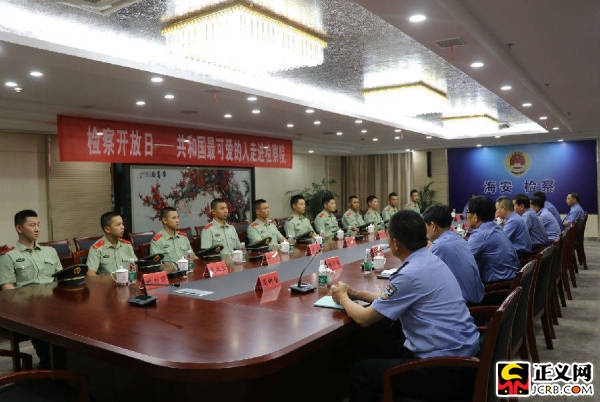 7月30日,江蘇省海安市檢察院舉行“檢察開放日——共和國最可愛的人走進(jìn)檢察院”活動,邀請武警海安中隊(duì)官兵走進(jìn)該院,參觀體驗(yàn)檢察工作。
