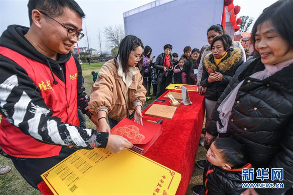 1月5日,工作人員在游園會活動現(xiàn)場為群眾印制分發(fā)新春年歷。當(dāng)日,浙江省杭州市余杭區(qū)塘棲村舉辦迎新春“幸福游園會”,內(nèi)容包括重現(xiàn)不同年代結(jié)婚場景、慶豐收甘蔗運(yùn)動會、傳統(tǒng)美食制作、趣味游戲等,讓當(dāng)?shù)匕傩赵谛腋g樂的氣氛中迎接即將到來的新春佳節(jié),同時也感受家鄉(xiāng)發(fā)展帶來的新變化。