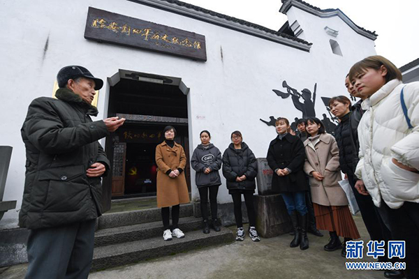 3月18日,在杭州市臨安區(qū)板橋鎮(zhèn)的臨安新四軍歷史紀(jì)念館,90歲的孟永迪老人(左一)在給鄉(xiāng)鎮(zhèn)的入黨積極分子講述革命歷史和他自己參加過的解放戰(zhàn)爭(zhēng)的親身經(jīng)歷。