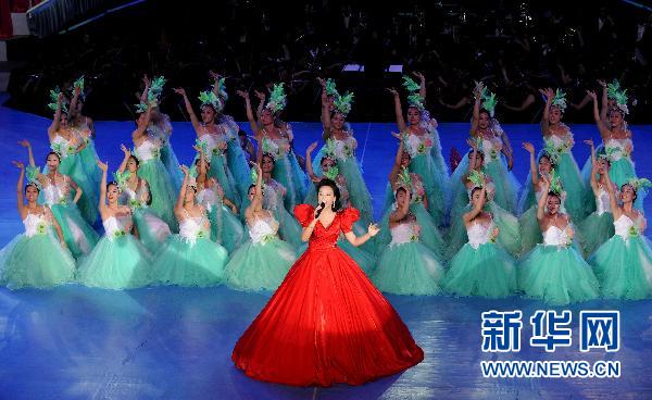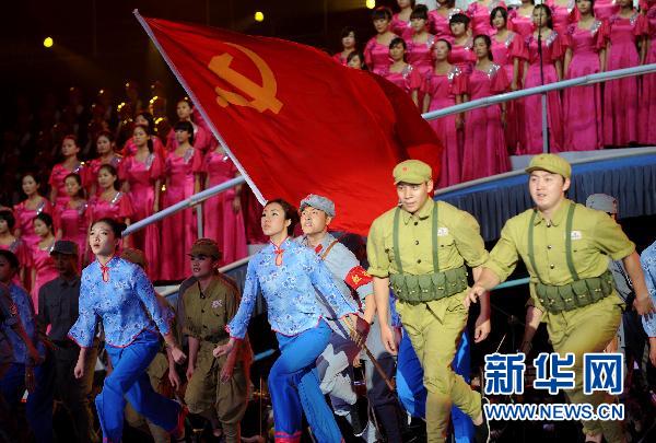 6月30日晚,演員在大型文藝晚會《唱支山歌給黨聽》中表演。當日,為慶祝中國共產黨成立90周年,云南省精心策劃的大型文藝晚會《唱支山歌給黨聽》在昆明市體育館舉行。該晚會以紅色經典為主線,結合云南獨特的少數(shù)民族風情,運用獨唱、合唱、舞蹈、朗誦等多種藝術形式和聲光電等技術手段,謳歌中國共產黨90年的光輝歷程和豐功偉績。新華社記者 藺以光 攝