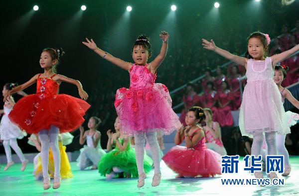 6月30日晚,一些小演員在大型文藝晚會《唱支山歌給黨聽》中表演。當日,為慶祝中國共產黨成立90周年,云南省精心策劃的大型文藝晚會《唱支山歌給黨聽》在昆明市體育館舉行。該晚會以紅色經典為主線,結合云南獨特的少數(shù)民族風情,運用獨唱、合唱、舞蹈、朗誦等多種藝術形式和聲光電等技術手段,謳歌中國共產黨90年的光輝歷程和豐功偉績。新華社記者 藺以光 攝