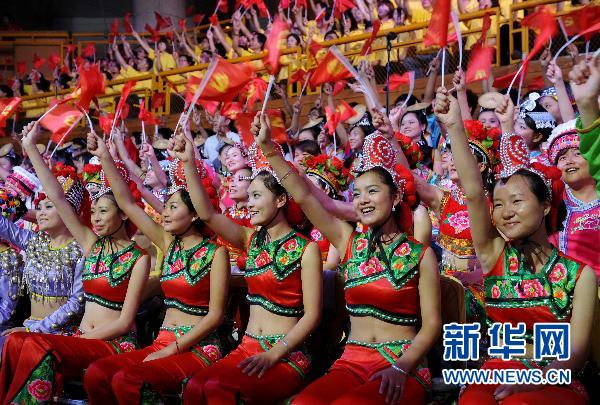 6月30日晚,一些少數(shù)民族學生在大型文藝晚會《唱支山歌給黨聽》中揮舞黨旗,為精彩演出加油助威。當日,為慶祝中國共產黨成立90周年,云南省精心策劃的大型文藝晚會《唱支山歌給黨聽》在昆明市體育館舉行。該晚會以紅色經典為主線,結合云南獨特的少數(shù)民族風情,運用獨唱、合唱、舞蹈、朗誦等多種藝術形式和聲光電等技術手段,謳歌中國共產黨90年的光輝歷程和豐功偉績。新華社記者 藺以光 攝