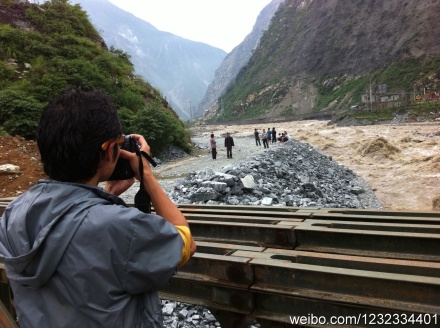 記者在國(guó)道213垮塌現(xiàn)場(chǎng)拍攝,現(xiàn)場(chǎng)滾石聲隆隆(華西都市報(bào)記者 李逢春 攝)