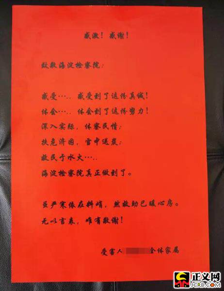 宣布會現(xiàn)場,被害人子女接過20萬救助金時,激動地對在場檢察官說:“我們沒有想到檢察官會主動跟我們提司法救助的事,更沒想到你們能救助我們這么及時和有力。我母親受傷后,家人心理上受到很大煎熬,現(xiàn)在每個月的醫(yī)療費都要十萬元,我們也試著尋求其他救助,但是程序繁瑣、幫助有限。最終是在檢察院我們切實地感受到了你們是真心想幫助我們……”隨后他們拿出精心準備的感謝信,一字一句讀出來:“海淀檢察院深入實際、體察民情;扶危濟困、雪中送炭……”