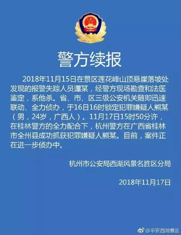 2018年11月15日,在景區(qū)蓮花峰山頂懸崖落坡處發(fā)現(xiàn)的報(bào)警失蹤人員譚某,經(jīng)警方現(xiàn)場(chǎng)勘查和法醫(yī)鑒定,系他殺。