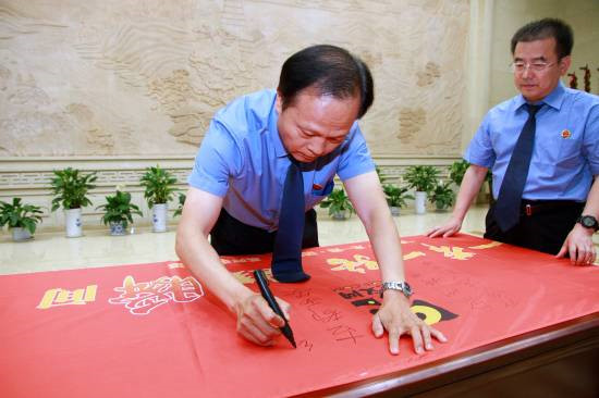 ▲西安市檢察院檢察長(zhǎng)張民生在“一帶一路 檢察瞬間”系列活動(dòng)的旗幟上簽名。呂珊珊 攝