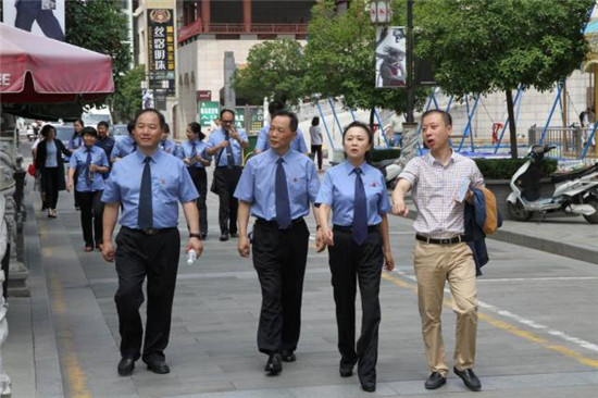 ▲西安市蓮湖區(qū)檢察院檢察長(zhǎng)李潔帶領(lǐng)檢察官們向大唐西市商戶征求服務(wù)意見。呂珊珊 攝