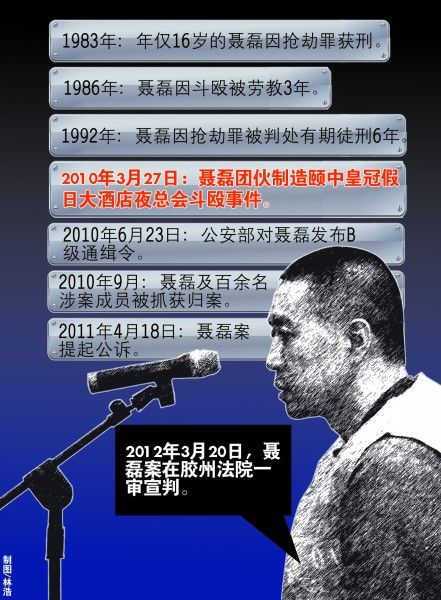 2010年9月,按照公安部、山東省公安廳有關(guān)部署,在青島市委、市政府領(lǐng)導下,青島市公安機關(guān)經(jīng)過深入調(diào)查、縝密偵查,一舉摧毀了以聶磊為首的涉嫌黑社會性質(zhì)犯罪組織,首犯聶磊及百余名成員被抓獲歸案。經(jīng)公安機關(guān)初步偵查,該犯罪組織涉嫌組織、領(lǐng)導、參加黑社會性質(zhì)組織、故意殺人、故意傷害、非法持有槍支彈藥、組織賣淫、販毒、尋釁滋事、敲詐勒索、開設(shè)賭場等多項犯罪。