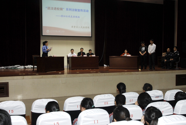 為迎接黨的十八大召開,加強(qiáng)社會(huì)主義法治理念教育活動(dòng),奉賢區(qū)檢察院開展模擬法庭進(jìn)校園活動(dòng)。該院未檢科選擇今年審理的一起以高利貸形式詐騙在校學(xué)生錢財(cái)?shù)牡湫桶讣?通過青年干警形象逼真地模擬小品表演,再現(xiàn)詐騙犯罪情景,隨后開設(shè)模擬法庭進(jìn)行開庭審理,作以案論法的法制教育。庭審結(jié)束后,圍繞這起典型案例所暴露出的社會(huì)問題,檢察官與學(xué)生進(jìn)行交流互動(dòng),作法律法規(guī)知識(shí)的現(xiàn)場問答,提高學(xué)生們的法律常識(shí)。模擬法庭進(jìn)校園活動(dòng)現(xiàn)場氣氛熱烈,法制宣傳效果好,檢察干警的精彩表演,受到了師生們的一致好評(píng)!