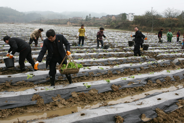 江西省安遠(yuǎn)縣檢察院充分利用"送政策、送溫暖、送服務(wù)"活動平臺踐行政法干警核心價值觀。2012年3月1-2日,該院組織二十名檢察干警赴該院掛點鄉(xiāng)雙芫鄉(xiāng)津槎村、雙芫村開展義務(wù)勞動,與煙農(nóng)一同強(qiáng)抓農(nóng)時促生產(chǎn),移栽煙苗十余畝。