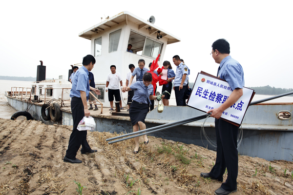 山東省鄄城縣舊城鎮(zhèn)有2個行政村、8000多人口居住在黃河對岸。6月26日,正值黃河調水調沙,浮橋拆除,為方便這里的群眾舉報申訴,該縣檢察院的檢察官乘船來到黃河對岸,舉行民生檢察聯(lián)系點和巡回接訪點揭牌儀式,并開展舉報宣傳。