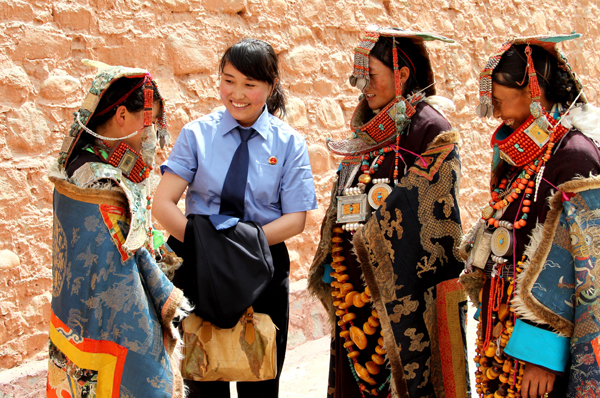 7月25日下午,西藏自治區(qū)阿里地區(qū)普蘭縣檢察院檢察官曲尼措姆與同事來(lái)到普蘭鎮(zhèn)科迦村,宣傳黨的富民政策和法律知識(shí)。圖為檢察官與剛剛參加完民俗服飾表演的藏族婦女交談。