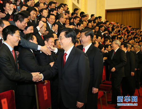 11月15日,國家主席胡錦濤,新當(dāng)選的中共中央總書記、中共中央軍委主席習(xí)近平等領(lǐng)導(dǎo)同志在北京人民大會堂親切會見出席黨的十八大代表、特邀代表和列席人員并發(fā)表重要講話。這是胡錦濤和習(xí)近平親切握手。新華社發(fā)