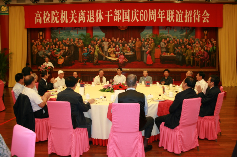 每逢重大慶典,高檢院機(jī)關(guān)均組織老同志參加慶;顒(dòng)。圖為2009年召開(kāi)離退休干部國(guó)慶60周年聯(lián)誼招待會(huì),曹建明檢察長(zhǎng)等院領(lǐng)導(dǎo)出席招待會(huì)。
