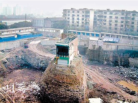 2007年3月初,網(wǎng)上開始流傳一個(gè)帖子,題目是《史上最牛的釘子戶》,內(nèi)容是一張圖片:一個(gè)被挖成10米深大坑的樓盤地基正中央,孤零零地立著一棟二層小樓,猶如大海中的一葉孤舟。(圖片來自網(wǎng)絡(luò))