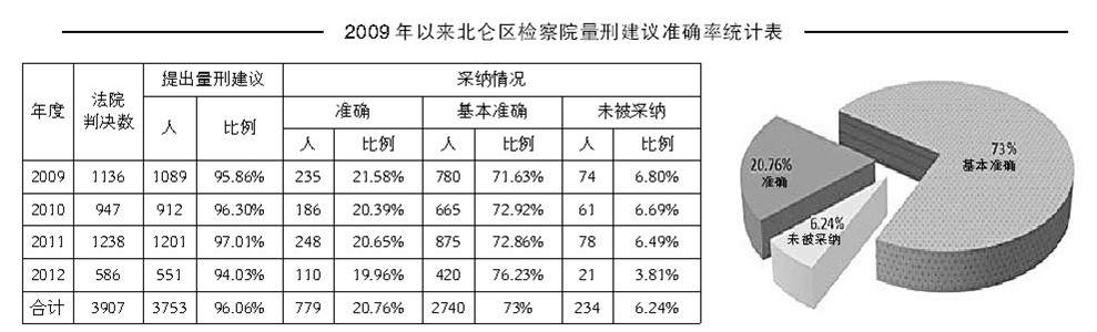 據(jù)統(tǒng)計,2009年至今,該院提起公訴3907人,提出量刑建議3753人,量刑建議比率達到96.06%。其中,建議與判決完全一致的占20.76%,建議基本準確(三年以下案件相差半年以內(nèi),三年以上案件相差一年以內(nèi))的占73%。