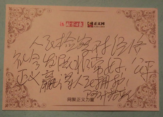 阿什老軌委員寄語(yǔ)檢察日?qǐng)?bào)社正義網(wǎng):公平正義贏得人民擁護(hù)
