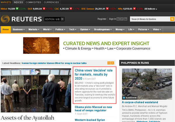 英國路透社網(wǎng)站頭版頭條報道:中國共產(chǎn)黨11月12日公布了未來10年的改革計劃,提出讓市場在資源配置中起“決定性”作用,希望帶領(lǐng)這個世界第二大經(jīng)濟(jì)體在未來持續(xù)增長。