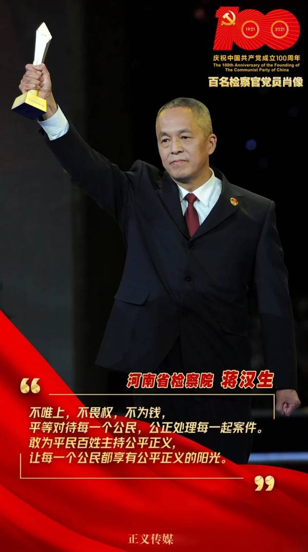 蔣漢生從檢28年,直接經(jīng)手辦理各類重大疑難案件500余起,其中刑事抗訴案件100余起。2005年,他被評為中國年度十大法治人物,同年獲評全國模范檢察官;2006年,當選第六屆中國十大杰出檢察官;2010年,被評選為十年法治人物;2018年12月,當選改革開放40周年政法系統(tǒng)新聞影響力人物。