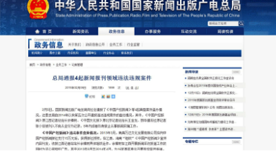 9月28日,國家新聞出版廣電總局再次公開通報(bào)一批違法違規(guī)案件的查處情況,共有15家媒體和17名采編人員被處罰和處理,分別是:《揚(yáng)子晚報(bào)》未經(jīng)核實(shí)刊發(fā)虛假新聞《男子搶20張火車票送女友 岳母大悅聘禮減半》,江蘇省新聞出版廣電局依法對(duì)《揚(yáng)子晚報(bào)》作出警告、罰款1萬元的行政處罰;湖北《武漢晚報(bào)》《荊州晚報(bào)》,江西《贛州晚報(bào)》,內(nèi)蒙古《包頭晚報(bào)》《內(nèi)蒙古晨報(bào)》《北方新報(bào)》《紅山晚報(bào)》未經(jīng)核實(shí)轉(zhuǎn)載“李玉剛臺(tái)北出家”的假消息,新聞出版廣電行政部門依法對(duì)上述7家報(bào)紙分別作出警告、罰款等行政處罰和處理;《南方都市報(bào)》原記者王星根據(jù)傳聞編寫了《河南平頂山女官員3個(gè)月前自殺官方至今未通報(bào)》一文,在微信公眾號(hào)“深℃”發(fā)布,王星被報(bào)社勸退,5年內(nèi)禁止從事新聞采編工作;《華夏時(shí)報(bào)》主辦的華夏網(wǎng)刊發(fā)虛假新聞《退休機(jī)務(wù)副總落馬南航三大重要部門全部淪陷》,新聞出版廣電總局依法給予華夏時(shí)報(bào)社警告、罰款的行政處罰;《南方都市報(bào)》所辦南都網(wǎng)、新聞客戶端及法人微博發(fā)布的假新聞《裸女跳河,救人者遭冷遇》,被海南《南國都市報(bào)》、江蘇《靖江日?qǐng)?bào)》、山東《生活日?qǐng)?bào)》分別轉(zhuǎn)載,新聞出版廣電行政部門依法分別對(duì)這4家報(bào)紙作出警告、罰款等行政處罰;湖南廣播電視臺(tái)都市頻道播出的假新聞《長(zhǎng)沙股民170萬四倍融資全倉一股兩跌停賠光跳樓》,《瀟湘晨報(bào)》未經(jīng)核實(shí)進(jìn)行轉(zhuǎn)載,湖南省新聞出版廣電局對(duì)湖南廣播電視臺(tái)和《瀟湘晨報(bào)》分別作出處罰。