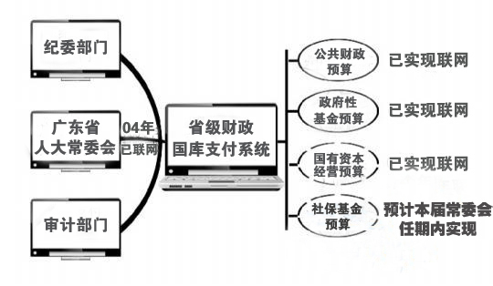 2004年,廣東省人大財經(jīng)委實(shí)現(xiàn)了與省財政廳國庫集中支付系統(tǒng)聯(lián)網(wǎng),廣東在全國率先實(shí)現(xiàn)省級公共財政預(yù)算支出聯(lián)網(wǎng)監(jiān)督。2010年,省級和21個地級以上市全部實(shí)現(xiàn)了人大財經(jīng)委與財政部門、審計(jì)部門的聯(lián)網(wǎng),此外,廣東省人大常委會不斷拓展預(yù)算聯(lián)網(wǎng)監(jiān)督覆蓋面,推進(jìn)監(jiān)督從公共財政預(yù)算資金、政府性基金預(yù)算資金擴(kuò)大到國有資本經(jīng)營預(yù)算資金和社;痤A(yù)算資金。