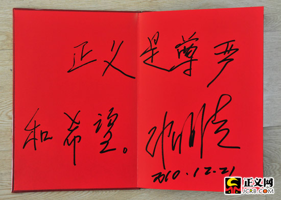 2010年12月21日,“童話大王”鄭淵潔為2010年度正義人物評選活動題詞:“正義是尊嚴和希望”。