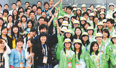 5月16日,卸任的復(fù)旦大學(xué)志愿者(左)與接替他們的華東師范大學(xué)志愿者在交接儀式上合影留念。當(dāng)日,上海世博園區(qū)首批來自北京、上海、天津等地的逾6000名青年志愿者集體卸任。