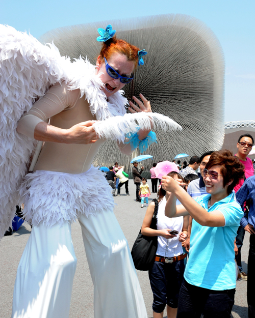 5月31日,世博園英國(guó)館的小丑演員與游客互動(dòng)。