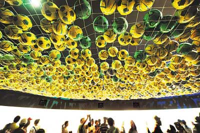 說起足球怎么可能少了巴西?作為唯一一個(gè)“全勤”參加了所有世界杯決賽并且5次捧杯的世界頭號(hào)足球強(qiáng)國,自然不會(huì)放過在世博會(huì)上展示他們足球文化的機(jī)會(huì)。更何況下屆2014年世界杯時(shí),巴西人將成為東道主。巴西館整個(gè)建筑猶如一個(gè)綠色“翻版鳥巢”,與足球有關(guān)的元素隨處可見。展館正面的外墻上安裝了一臺(tái)巨大的液晶顯示屏,播放足球游戲畫面。進(jìn)入展館,游客首先將走進(jìn)一個(gè)環(huán)形屏幕放映廳中,最吸引眼球的不是畫面精致的影片,而是你抬頭就能發(fā)現(xiàn)的驚喜——用數(shù)百個(gè)足球鋪就的天花板。在這里,館方在天花板上安裝了一張巨大的網(wǎng)兜,并在其中塞進(jìn)了數(shù)百個(gè)綠色、白色、藍(lán)色、黃色的足球,這些顏色也是巴西國旗的組成色。這一設(shè)計(jì)讓參觀者一進(jìn)入展廳便能感受到足球王國的魅力。