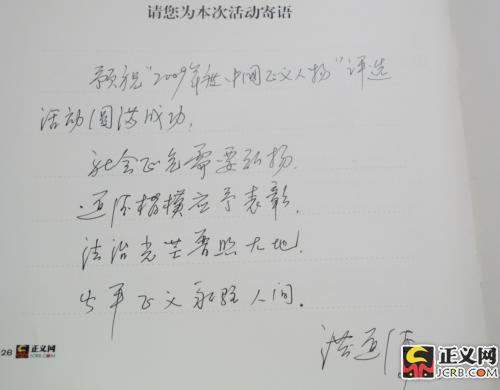 寄語(yǔ):預(yù)祝“2009年度中國(guó)正義人物”評(píng)選活動(dòng)圓滿成功,社會(huì)正氣需要弘揚(yáng),道德楷模應(yīng)予表彰,法治光芒普照大地,公平正義永駐人間。