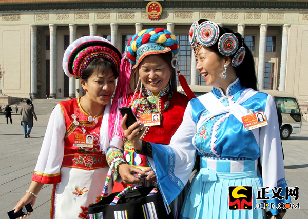 3月4日上午,十一屆全國(guó)人大四次會(huì)議召開(kāi)預(yù)備會(huì)。三位少數(shù)民族代表在人民大會(huì)堂前欣賞用手機(jī)拍攝的留影照。傅偉/攝