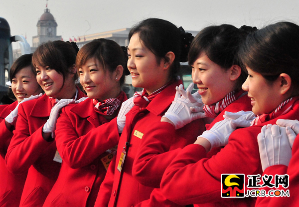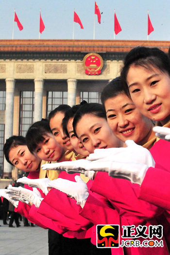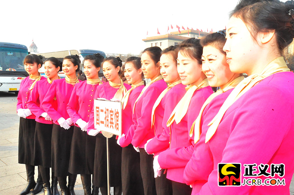 代表駐地的禮儀小姐為兩會增色添彩。靚麗的衣服和燦爛的笑容,使她們成為大會堂前一道靚麗的風(fēng)景線。程丁/攝