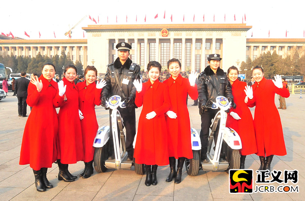 代表團駐地的禮儀小姐們在天安門廣場前與“智能單警”合影留念。程丁/攝