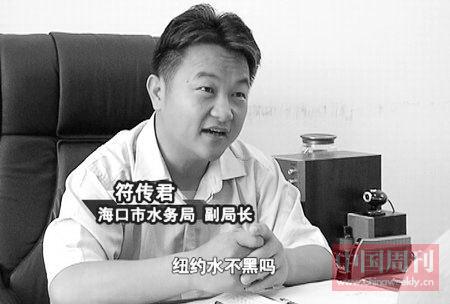 7月10日,網(wǎng)友“惡魔島”在新浪雜談發(fā)帖《最牛副局長(zhǎng)回應(yīng)水污染治理:越發(fā)達(dá)水越黑!》,其中稱?谒畡(wù)局副局長(zhǎng)在接受海南新聞?lì)l道記者采訪時(shí)說(shuō),越發(fā)達(dá)的地區(qū),水就會(huì)越黑:7月6日,當(dāng)?shù)赜浾卟稍L符傳君問(wèn)及“為什么常年未能解決海口污水”,符傳君卻回答“中山、東莞一帶,包括我們現(xiàn)在的在長(zhǎng)江三角洲附近的、蘇州、浙江一帶,就是說(shuō)只要發(fā)達(dá)的地區(qū),越發(fā)達(dá),水越黑。 ”