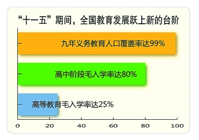 張力:“十一五”期間,全國教育發(fā)展躍上新的臺階,九年義務(wù)教育人口覆蓋率達99%,接近全面普及;高中階段毛入學(xué)率提升27個百分點,實現(xiàn)了80%的預(yù)期目標(biāo);高等教育穩(wěn)步發(fā)展,毛入學(xué)率從21%增至25%。如果說,新世紀(jì)第一個五年我國初步實現(xiàn)了從人口大國向人力資源大國的轉(zhuǎn)變,到第二個五年末,則可以說這一轉(zhuǎn)變的基礎(chǔ)更為牢靠。