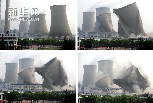 浙江電廠爆破90米巨型冷卻塔這是9月16日拍攝的爆破冷卻塔過程(拼版照片)。舊機(jī)組關(guān)停后,每年可節(jié)約標(biāo)準(zhǔn)煤50多萬噸,減少二氧化硫排放1000多噸,減少粉塵排放300噸左右。 新華社記者徐昱攝
