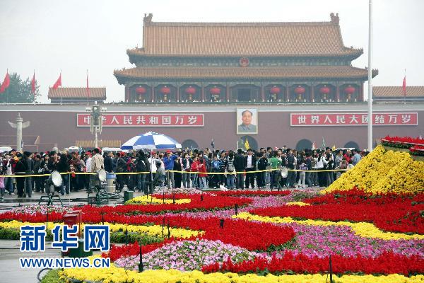 2010年10月2日,游客在北京天安門廣場(chǎng)游覽。當(dāng)日,北京天氣晴好,天安門、故宮地區(qū)迎來如潮的游人。 新華社發(fā)(陳柏材 攝)