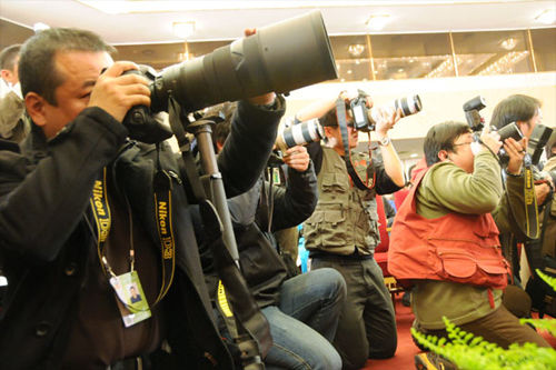 3月2日,全國政協(xié)十一屆二次會議舉行首場新聞發(fā)布會,這是發(fā)布會上正在工作的攝影記者。